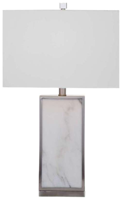 The Adair Table lamp has a clean rectangular base and an elegant marble finish. This lamp is a simple yet beautiful addition to any living area. The white marble body is surrounded by a complimentary silver brushed metal frame.Read More