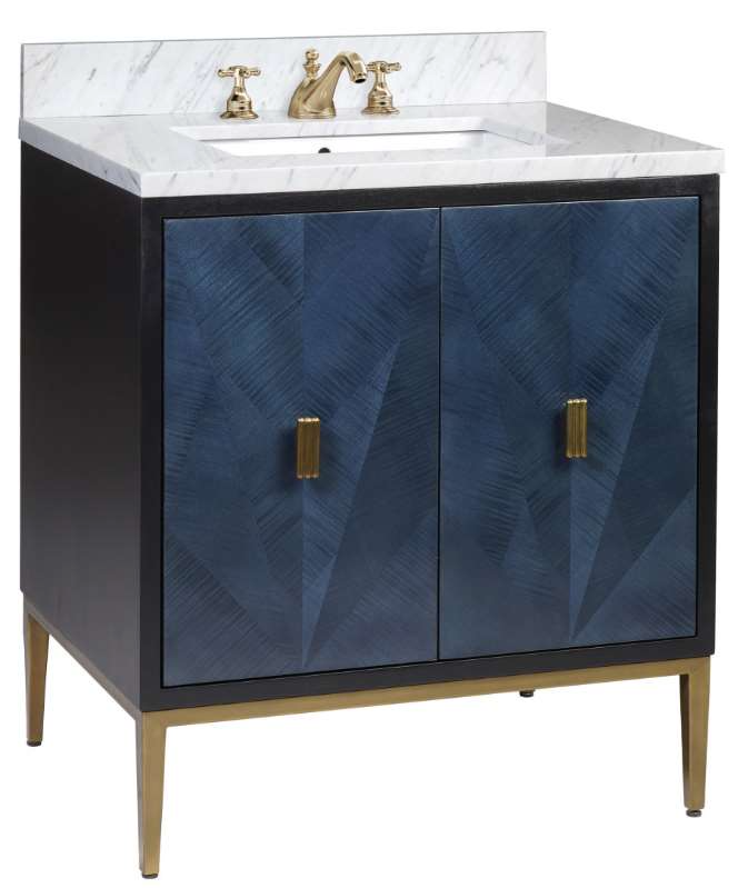 The Kallista 30" Blue Vanity has a dark sapphire blue finish that enlivens the sycamore veneers on its door fronts. The exterior is finished in a glossy caviar black. The vanity sits atop antique brass iron legs and the matching hardware is made of cast brass.Read More