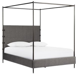 Bring texture into play. This iron canopy bed features a headboard upholstered in a versatile grey fabric with decorative faux leather straps. Standard box spring required. This bed is not compatible with an adjustable mattress.Read More