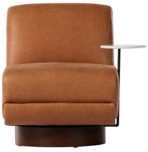 A stylish play on function. In tan top-grain leather, armless accent seating tops a rounded parawood swivel base, wire-brushed for subtle vintage vibes. Option to pair with matching side table, which can be fastened to or removed from either side with ease.Read More