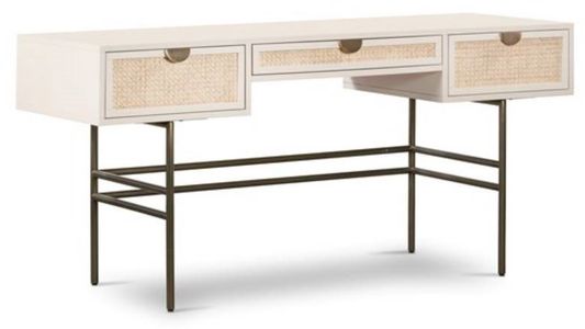 Bring a light look to the modern office. A lacquered three-drawer desk features woven cane panels and half-moon hardware finished in an aged brass. Make a bold statement by incorporating this stunning desk into your home.Read More