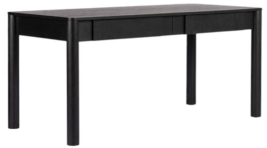 A two-drawer writing desk of black-finished oak features clean lines for a classic look.