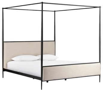 Streamlined and refined. Tapered at the top and bottom, this textured black iron canopy bed fashions a comfortable headboard upholstered in a classic cream hue for contrast. And this will be a great fit into our home.Read More