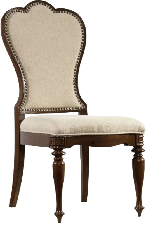 A sculptured, striking silhouette with inviting alabaster-colored fabric on the front and seat and a carved, swirled ribbon-motif wood back, the Leesburg upholstered side chair gives a fashion flair to classic style. Crafted of exquisite mahogany veneers.Read More