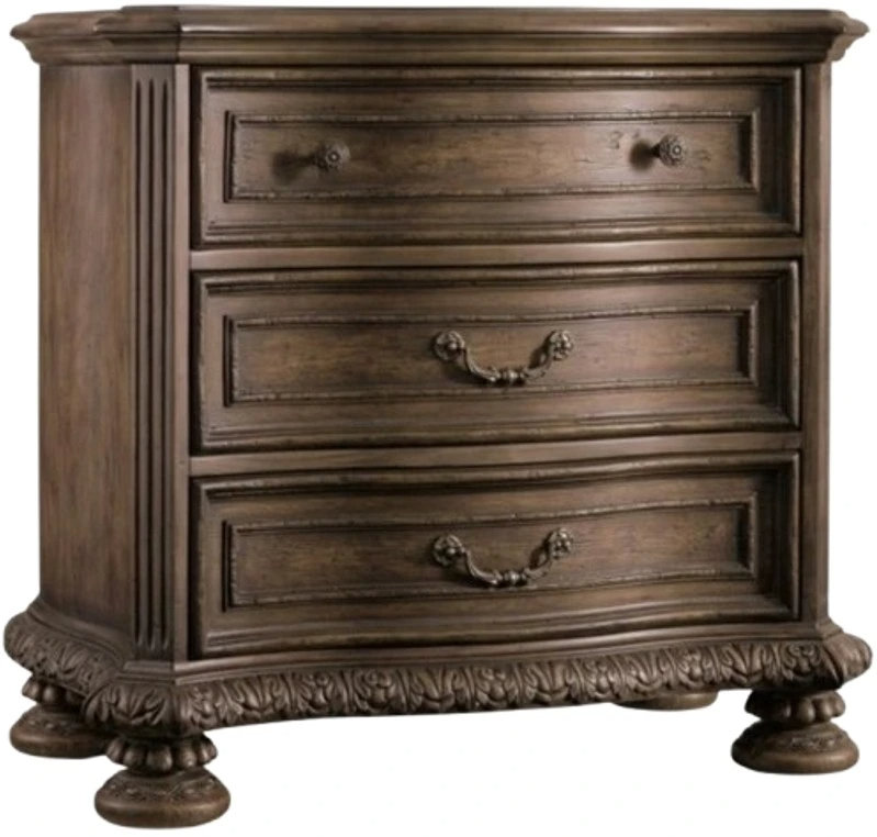 The Rhapsody three drawer nightstand brings together classic style elements and a relaxed, rustic finish in an impassioned marriage of casual opulence. Exuberant design motifs such as an acanthus leaf molding around the base, column motifs on the edge of the case and ornate bun feet infuse the piece with emotion.Read More