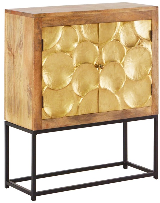This handsome and versatile cabinet is constructed of mango timber in a water-resistant lacquer sealed multi step blended finish and sits atop a sturdy black powder coated iron stand. The doors, which feature hand carved and routed detail overlain with brass foil, open to reveal a shelved interior.