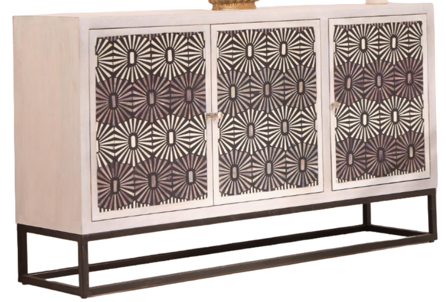 The framed door fronts feature striking designs of hand set bone inlay in shades of gray and off-white -over MDF for stability. The open bases are iron in a "natural" finish-and the cabinets boast ample shelved interiors for concealed storage