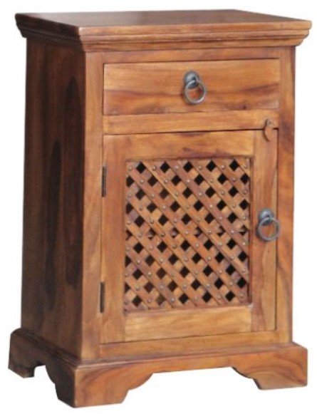 Elevate your bedroom with the Ganga Latic Jali Bedside Table. Crafted with intricate lattice detailing, it adds a touch of elegance to your space. With ample storage and a stylish design, it seamlessly combines functionality and aesthetics. Simplify your bedside organization with this charming addition to your room.Read More