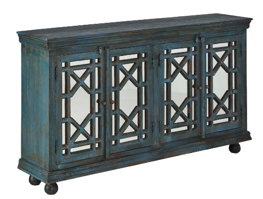 This sideboard/cabinet is constructed, using tongue and groove joint methods, of mango wood in a water resistant lacquer sealed turquoise finish