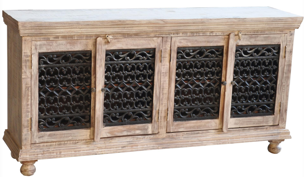 Jali is the Hindu term for a latticed screen normally crafted with a combination of calligraphy and geometry. The case of this plasma is constructed, using tongue and groove joint methods, of mango wood in a water resistant lacquer sealed whitewash finish-and the door panels are intricately patterned cast iron