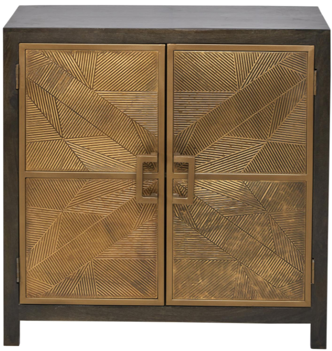The doors are overlain with panels of brass sheeting-hand stamped with an "intersecting shapes" design. Substantial brass pulls and an ample shelved interior complete this versatile package