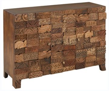 The Omisha Cabinets are constructed, using tongue and groove joint methods, of mango timber in a water resistant lacquer sealed dark blended finish. The door and drawer fronts as well as the forward feet feature hand set reclaimed print blocks-making each item a bit unique.Read More