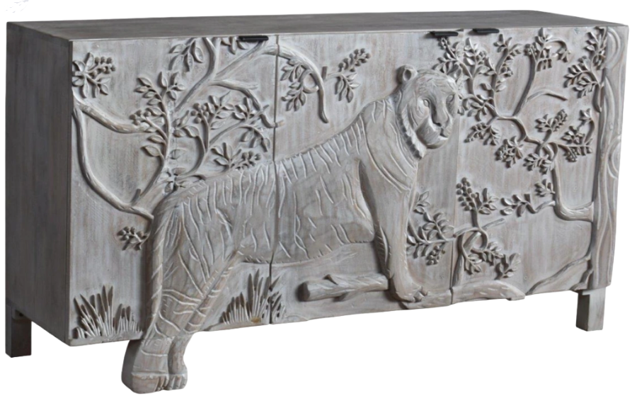 The Jaipur Furniture Tiger Credenza Cabinet boasts a striking design with bold, tiger-inspired patterns. Crafted from high-quality wood, it features ample storage space with its well-organized compartments and doors, adding a touch of exotic elegance and practicality to any room.Read More