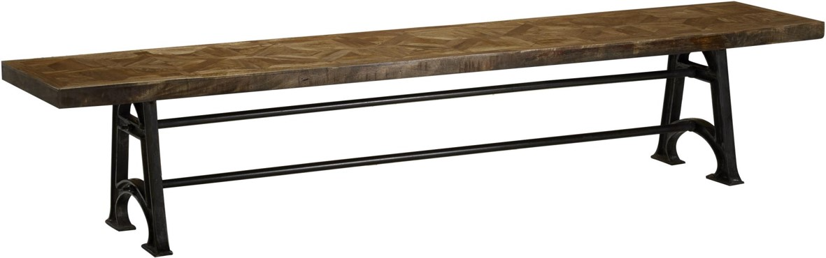 Ideal as seating for the Unwin 72" Dining Table-or as a handsome addition to an entryway, mudroom, etc. The bench features a heavy black iron base and a top crafted by hand-setting strips of reclaimed wood atop a solid core of new timber.Read More