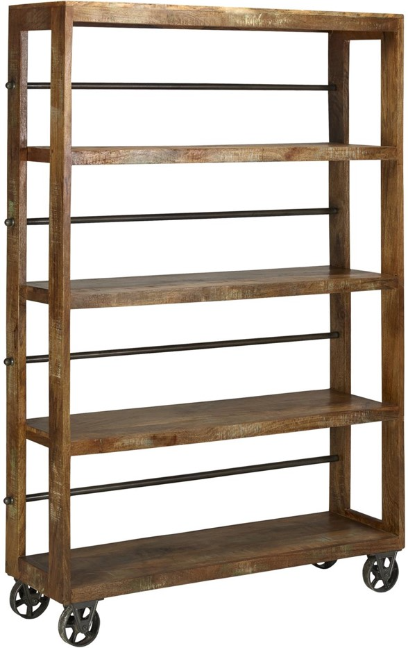 Constructed of mango timber in our popular Sawan finish-a rustic water resistant lacquer sealed treatment allowing for slight paint hangup, this mobile "bookcase" features cast iron wheels and powder coated iron rods. With the look of a reclaimed factory staple, this handsome unit finds pride of useful place in a variety of room settings.Read More