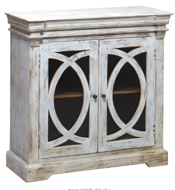 The Witt cabinets are constructed of mango timber in a water-resistant lacquer sealed whitewash finish. Details include stacked tops, notched bases, shelved interiors, concentric ring overlays on wood framed glass doors and simple brass-finished knobs.Read More
