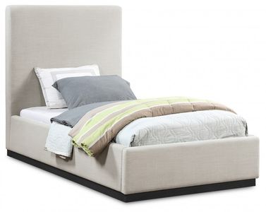 Give your bedroom a regal vibe when you add this Alfie linen textured fabric bed to the mix. The ultra tall headboard on this full-size bed makes a bold impression from all angles and is covered in rich beige linen textured fabric that forms a pleasant contrast with the black finish solid wood base.Read More