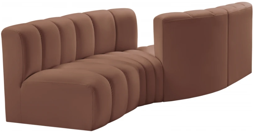 Unleash modern opulence with the Arc Vegan leather modular sofa. Crafted for the modern connoisseur, this sofa injects an air of refined luxury into any space. Its sleek silhouette, upholstered in supple cognac vegan leather, exudes timeless sophistication while the deep channel tufting adds textural intrigue, further elevating the chair's visual appeal.Read More