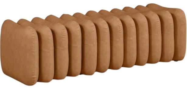 A bold and modern statement piece is the Atticus cognac vegan leather upholstered bench that will elevate any room. Its unique, segmented design adds visual interest, while the plush cognac vegan leather upholstery provides comfort and style. Perfectly versatile, this bench is an eye-catching addition to your home.Read More