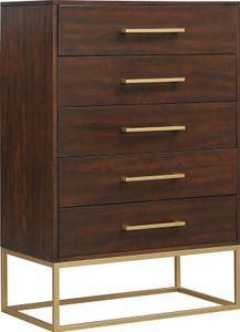 Outfit your space with this Maxine chest, part of the Maxine collection of contemporary bedroom furniture. This lovely chest features a dark cherry finish over birch veneer construction for durability, strength, and resilience, and it’s equipped with brushed gold metal legs and hardware for a simplistic yet elegant finish.Read More