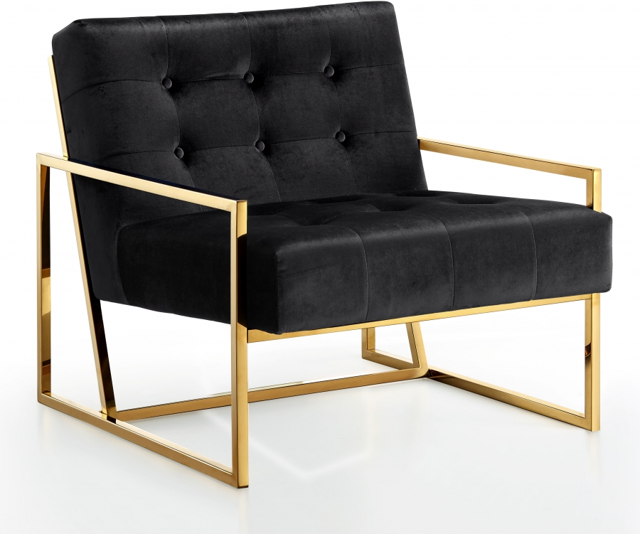 Give your room a touch of elegance and refinement with this ultra modern Pierre black velvet accent chair. The base is made from stainless steel, so it's durably tough and strong enough to withstand heavy daily use. The base is finished in a gold tone hue, adding to its luxurious feel. Tufting on the thick back and seat cushions add to their durability and give it a welcoming look. The black color makes the chair an easy fit with existing furnishings.