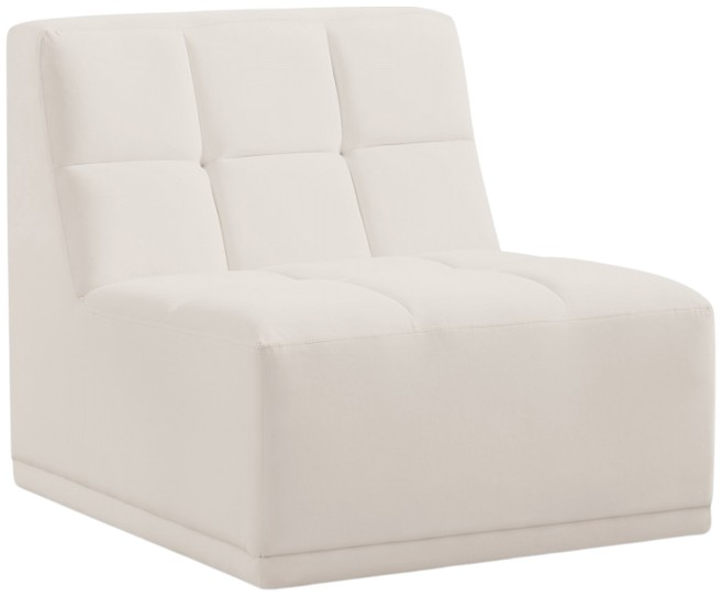 Bolster a contemporary vibe in your living room with this Relax cream velvet armless chair. Soft cream velvet upholstery offers delicate comfort, making this chair cozy for anyone who sits in it. Biscuit tufting gives this chair texture and its lack of arms creates modern style.Read More