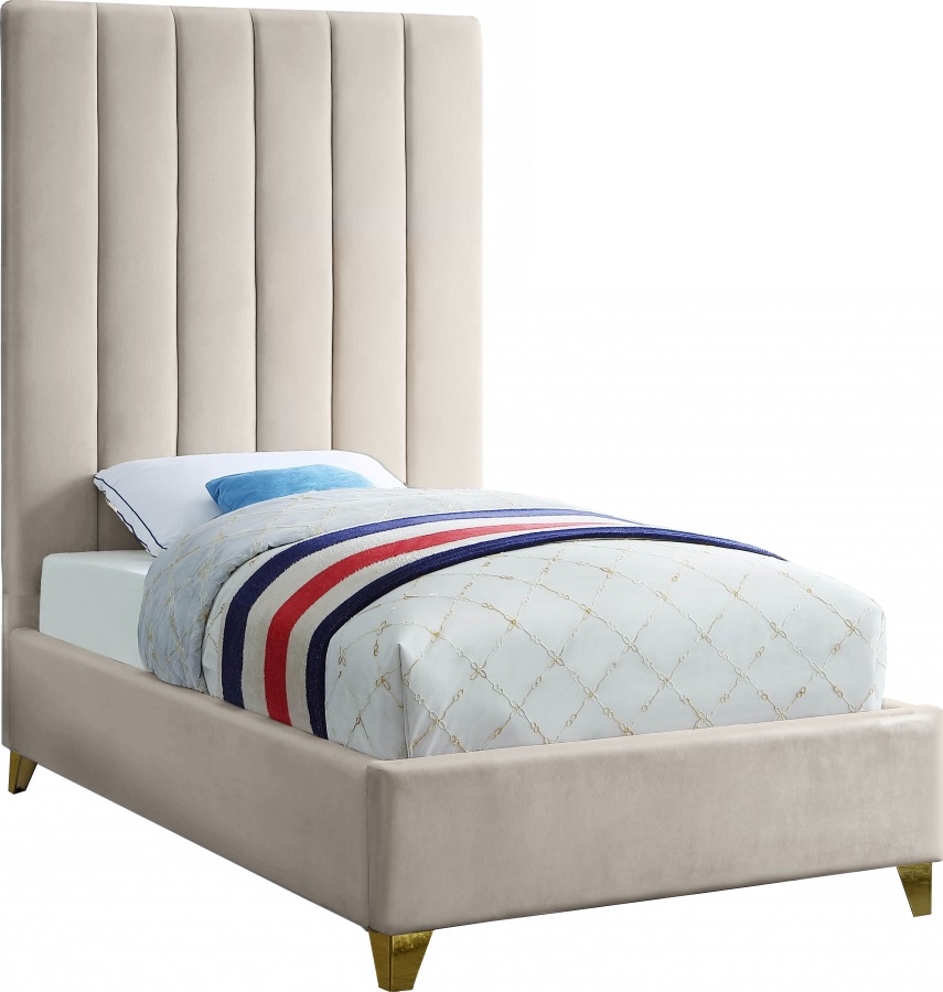 Take the look of your bedroom to new decorative heights with this ultra-modern Via twin upholstered bed. Rich cream velvet upholstery gives this bed a true upscale feel and epitomizes fine living while channel tufting along the headboard keeps the padded material inside plump.Read More