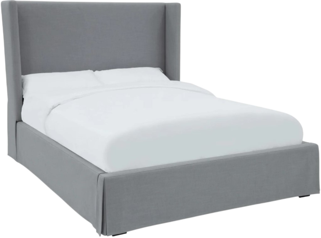 Designed with clean lines in an array of colors, our Juliette upholstered bed collection brings relaxed luxury to your bedroom. Made with solid wood framing, layered foam and soft linen-blend fabric, this group creates a no-maintenance slipcover look with skirted bases and inverted corner pleats. Available in panel, wingback, camelback and clipped corner configurations.